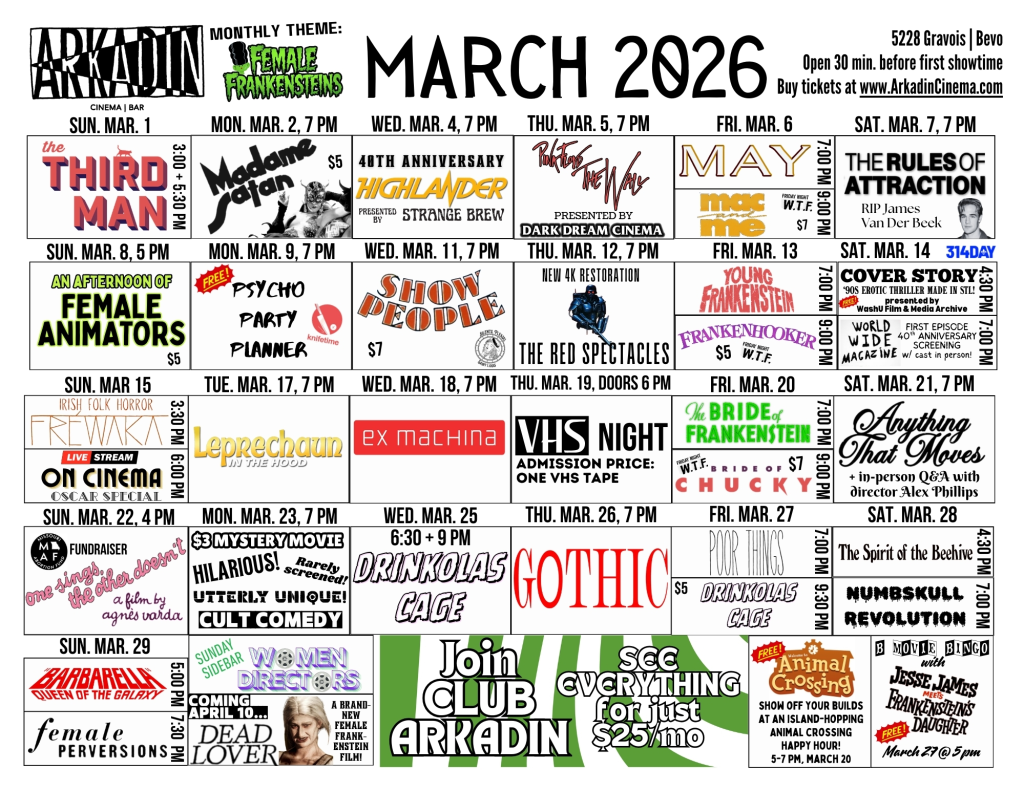 SEE FULL CALENDAR OF EVENTS Upcoming Events Feb 18 7:00 pm – 9:00 pm DINNER IN AMERICA (2020) w/ punk rock love songs pre-show Feb 19 7:00 pm – 10:00 pm VHS NIGHT — Admission Price: One VHS Tape Feb 20 6:30 pm – 8:15 pm WHAT’S UP, DOC? (1972) w/ Barbra Streisand pre-show Feb 20 8:30 pm – 10:00 pm S&M rom-com SECRETARY (2002) Feb 21 5:00 pm – 7:00 pm SOMETHING WILD (1986) w/ New Wave pre-show Feb 21 7:30 pm – 9:30 pm MAUVAIS SANG (a.k.a. Bad Blood, 1986) presented by Lost in the Arthouse Feb 22 3:00 pm – 4:45 pm Cary Grant & Irene Dunne in THE AWFUL TRUTH (1937) Feb 22 5:00 pm – 7:00 pm Cult Classic Sci-Fi Indie THE BROTHER FROM ANOTHER PLANET (1984) View Calendar FOLLOW US ON SOCIAL MEDIA Facebook Twitter Instagram arkadincinema “A mesmerising, outlandish and warm-hearted indie Tomorrow at 7 pm see DINNER IN AMERICA. Playing at 🚨🚨🚨Announcing March at Arkadin!🚨🚨🚨 Why should Jes This week at Arkadin Cinema! Each month, Arkadin presents a selection of FOLK H Alright, enough with Valentines. Put ‘em up and jo Cult classic indie sci-fi THE BROTHER FROM ANOTHER Kudos to our Y2K Galentine’s fashion show particip “The greatest romantic comedy to be released in re “A masterpiece of ecstatic cinema from 1986… With What better way to celebrate the first Friday the “Joyfully offbeat… It’s vivaciously funny and sexy “An authentic and awkward love story between two o “A small groundbreaking comedy, a contemporary Cin “A marvelous black comedy full of wit and journali Rom-com superstars Tom Hanks and Meg Ryan star in “Influenced…by Alice in Wonderland and the paintin “Literally reels of pure, unadulterated and sustai Today at 7 p.m. @silentspleasestl presents CITY LI Next week it's the third Monday of the month, and Load More Follow on Instagram Skip back to main navigation