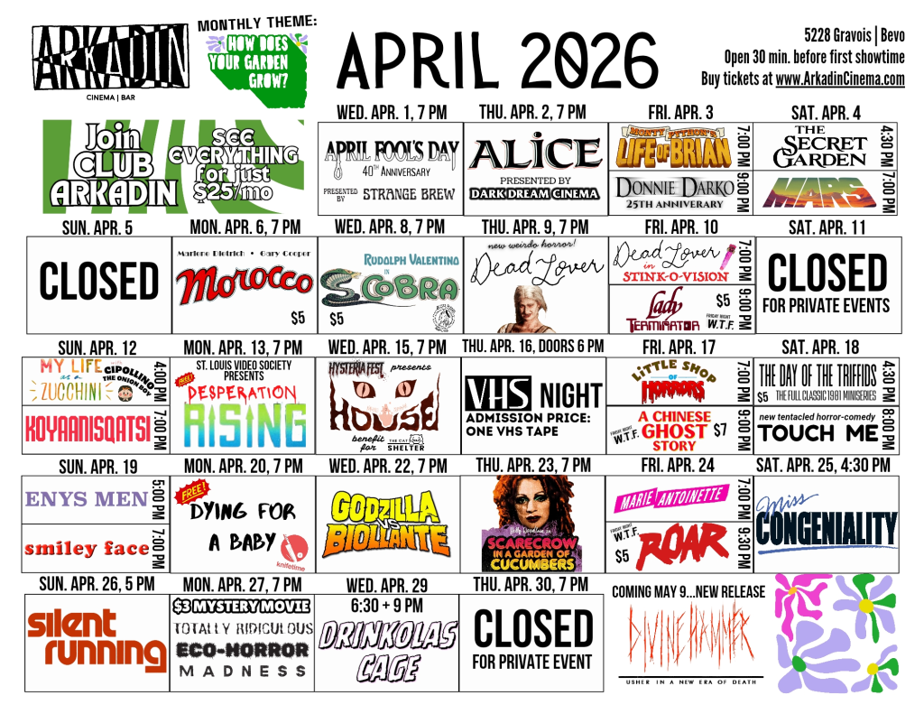 SEE FULL CALENDAR OF EVENTS Upcoming Events Apr 10 7:00 pm – 9:00 pm DEAD LOVER (2025) in Stink-O-Vision! Apr 10 9:00 pm – 10:30 pm LADY TERMINATOR (1988) — Friday Night WTF! — $5 Apr 12 4:00 pm – 6:00 pm Stop-motion animated treasure MY LIFE AS A ZUCCHINI (2016) w/ Cipollino the Onion Boy (1972) Apr 12 7:00 pm – 8:45 pm KOYAANISQATSI (1983) presented by Lost in the Arthouse Apr 13 7:00 pm – 9:00 pm Psychedelic sleaze-burger DESPERATION RISING (1989) presented by St. Louis Video Society Apr 15 7:00 pm – 9:00 pm HOUSE (1977) — 7 PM Showtime Sold Out! Apr 16 7:00 pm – 10:00 pm VHS NIGHT — Admission Price: One VHS Tape Apr 17 7:00 pm – 8:45 pm LITTLE SHOP OF HORRORS (1986) — 40th anniversary screening w/ killer plants pre-show View Calendar FOLLOW US ON SOCIAL MEDIA Facebook Twitter Instagram arkadincinema Next Friday our WTF feature is A CHINESE GHOST STO @stlvideosociety returns on Monday, April 13 with Tomorrow our Friday Night WTF feature is LADY TERM The film we were so excited to share with you we p Each month, DRAWN VISIONS presents an outré gem fr These two are definitely plotting some Lifetime mo Find out what all of the stink is about! Tomorrow An unconventional work in every way, Godfrey Reggi “One of the finest installments in the Godzilla fr “A wicked, witchy folk freak horror… the witchy at Though adapted before and after, John Wyndham’s cl “The tentacled erotic horror comedy you didn’t kno “Pure madness! The 1987 cult classic is wonderfull This week at Arkadin Cinema! Coming this Friday...LADY TERMINATOR. Playing 4/10 “Funny, fun, catchy, and well worth its reputation “At the height of his beauty, Rudolph Valentino en A handcrafted stop‑motion treasure, MY LIFE AS A Z Join us in THE SECRET GARDEN. Playing today at 4:3 KOYAANISQATSI plays at Arkadin on Sunday, April 12 Load More Follow on Instagram Skip back to main navigation