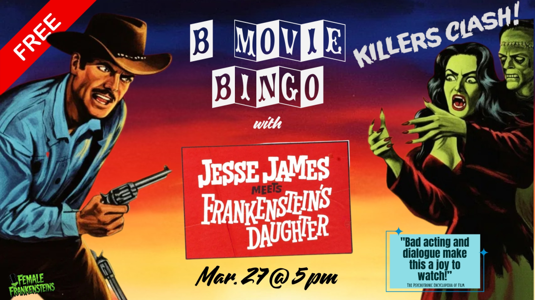 Saddle up for chaos as we play B-Movie Bingo along with bad-movie anti-classic JESSE JAMES MEETS FRANKENSTEIN’S DAUGHTER hits the screen. Each audience member gets their own Bingo Card with spots like “Mad Scientist’s Lab” or “Buff Shirtless Monster.” Spot the clichés, call out the camp, and compete for prizes!