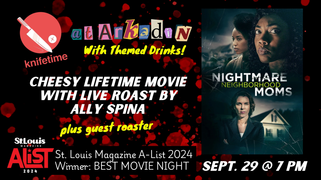 KNIFETIME is a series hosted by Allyson Spina where we revel in the cheesy glory of a bad Lifetime Original Movie! Featuring a special movie-specific drink special and wisecracking commentary from local comedians, this FREE one-of-a-kind event is the 2024 winner of St. Louis Magazine’s A-List Award for Best Movie Night!