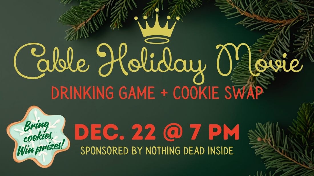 The stockings are hung by the chimney with care, there’s a decorated tree in every room and there’s some crisis afoot that’s threatening the magic of Christmas! At least that’s what we assume is happening in the plot of the surprise cable-Christmas movie we’ll be playing at our annual cookie exchange + drinking game! We’ll put on a holiday movie of the greeting-card-company-variety and write a drinking game to go along with it, à la Drinkolas Cage. You come and play along and bring some of your favorite Christmas cookies to share with the crowd!