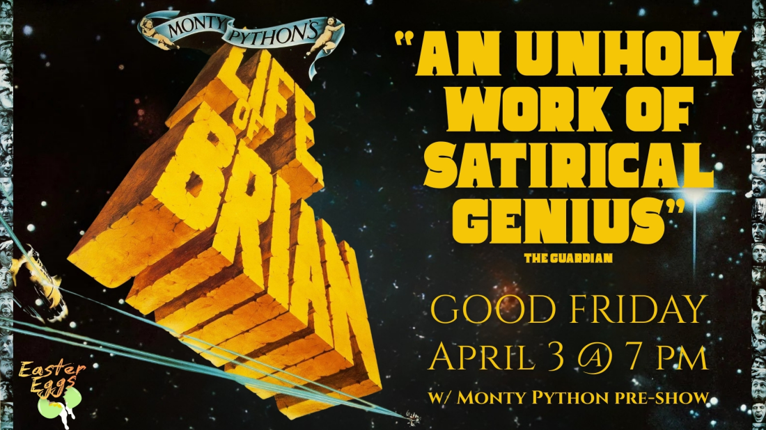 This Good Friday, enjoy a biting satire of religious dogma that is, at its heart, a stirring paean to tolerance. While perhaps not quite as popular as Holy Grail, LIFE OF BRIAN is Monty Python’s true masterpiece—an inspired, brilliant, send-up of the blockbuster biblical epic that raised the hackles of Christian fundamentalists the world over when it was first released but has gone on to be recognized as one of the greatest comedy films ever made. In a stable in ancient Jerusalem, a child is born—a child who will grow up to be … Brian (Graham Chapman), an ordinary Judean who goes on to live an extraordinary life, entangled in a plot to overthrow the Roman empire and mistaken for the Messiah, among other unlikely events. Featuring ribald Roman puns, sharp political commentary, and an audacious crucifixion-themed musical number, the Pythons’ most ambitious film is a hilarious lampooning of blind faith in which nothing is sacred.