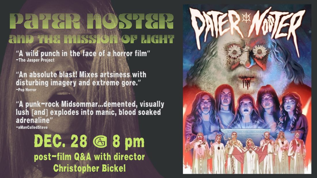 PATER NOSTER AND THE MISSION OF LIGHT tells the story of Max, a young record store clerk who stumbles upon a rare vinyl LP and is drawn into the world of a 1970s hippie commune. An invitation to the remnants of the outlandish cult and their unholy spawn leads to grave and grisly circumstances for Max and her friends. The film’s producers, led by cult director Christopher Bickel, have pulled off a no-budget coup in bringing this grim vision to life, with a team of award-winning practical special effects artists and a hauntingly atmospheric score that will immerse audiences in a world of relentlessly trippy terror.