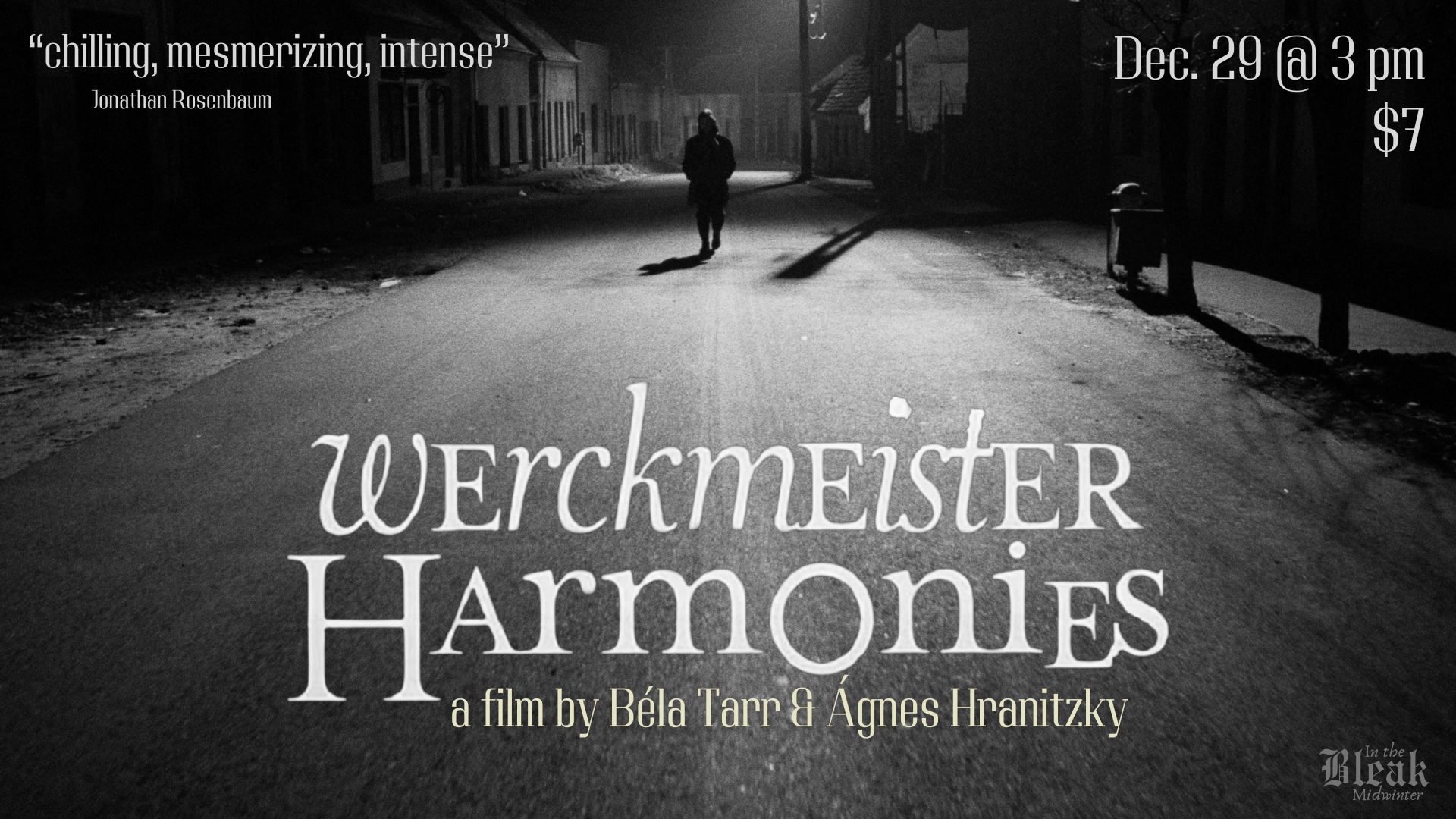 Due to unforeseen circumstances, we've had to cancel this screening. Werckmeister Harmonies will be rescheduled next year. We apologize for the inconvenience. "Chilling, mesmerizing, intense...essential viewing, especially for anyone new to Tarr’s cinema" -Jonathan Rosenbaum This mesmeric parable of societal…
