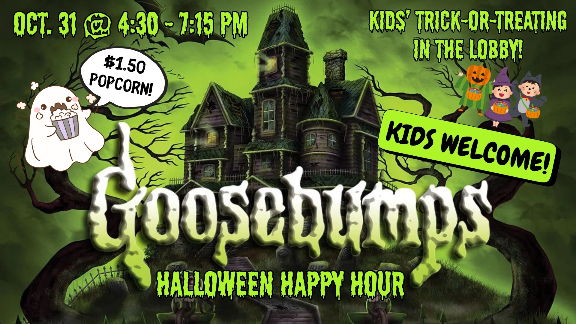 Come one, come all! It's Halloween, and the ghosts and ghouls are out tonight! This is a very special Free Friday Happy Hour where we'll not only be playing the best of the best GOOSEBUMPS episodes in the theater, we've…