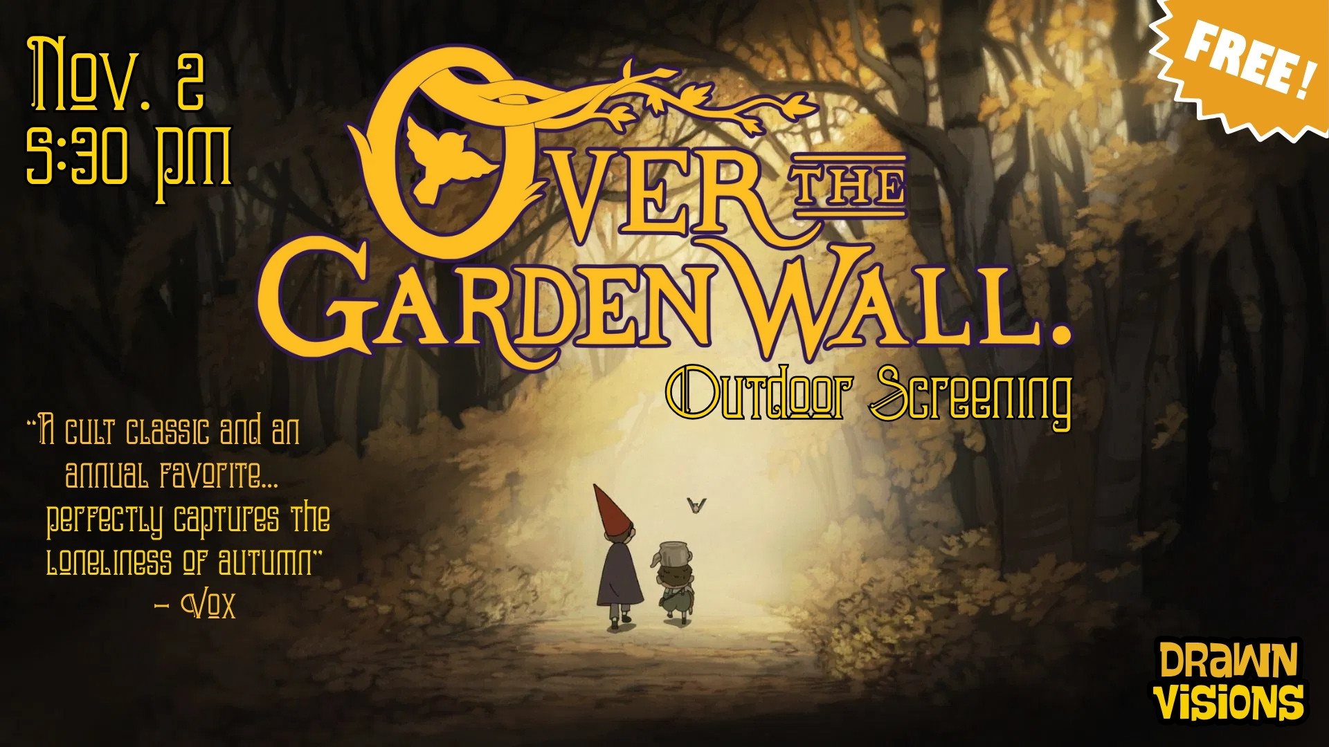 WE HAVE ADDED AN INDOOR SCREENING AS WELL! GUESTS CAN SIT INDOORS OR OUTDOORS. “A cult classic and an annual favorite...perfectly captures the loneliness of autumn.” - Vox It's Fall, and you know what that means...Time to (re)watch OVER THE…