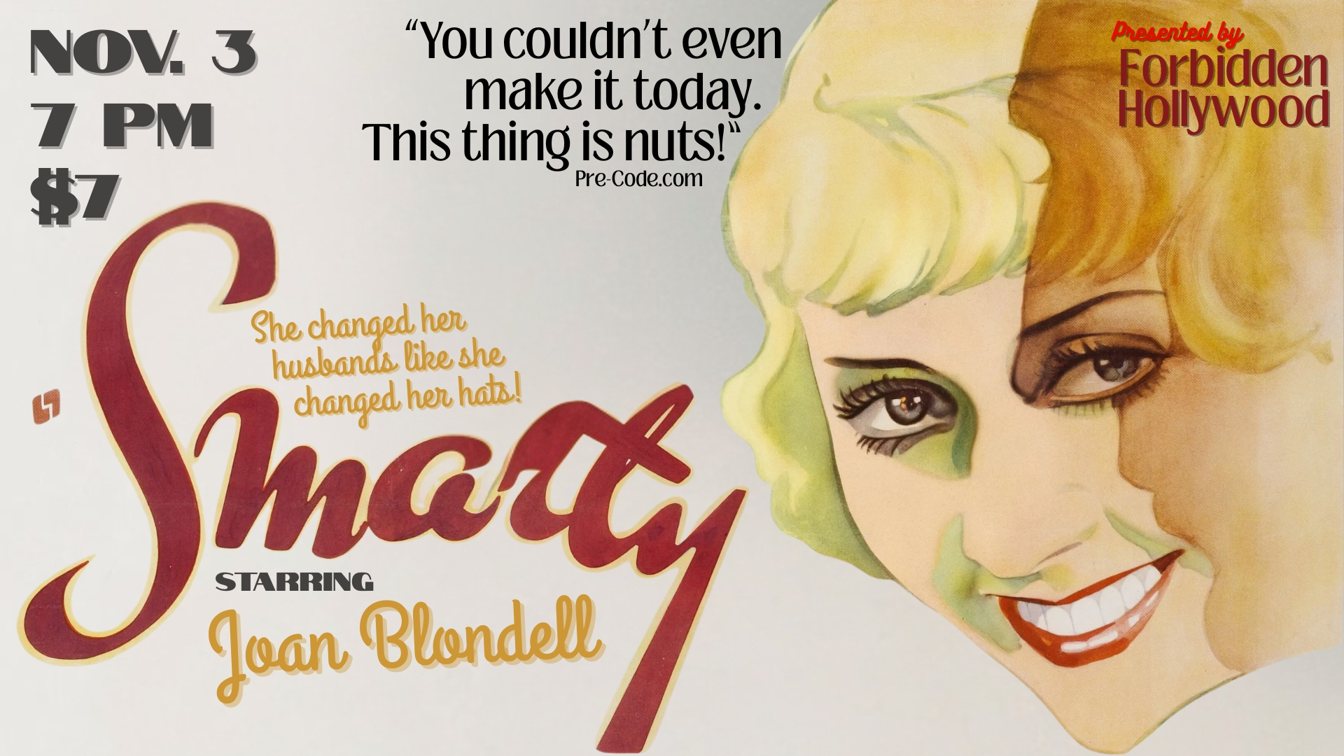 Marketed with the taglines “A picture with a wallop!” and “She changed her husbands like she changed her hats,” Warner Brothers’ 1934 comedy SMARTY may be more accurately described by its UK title, Hit Me Again. Vivacious Joan Blondell stars…